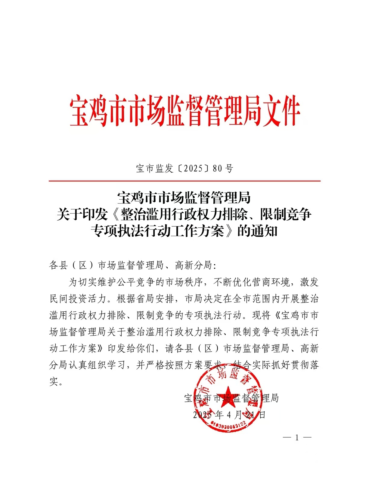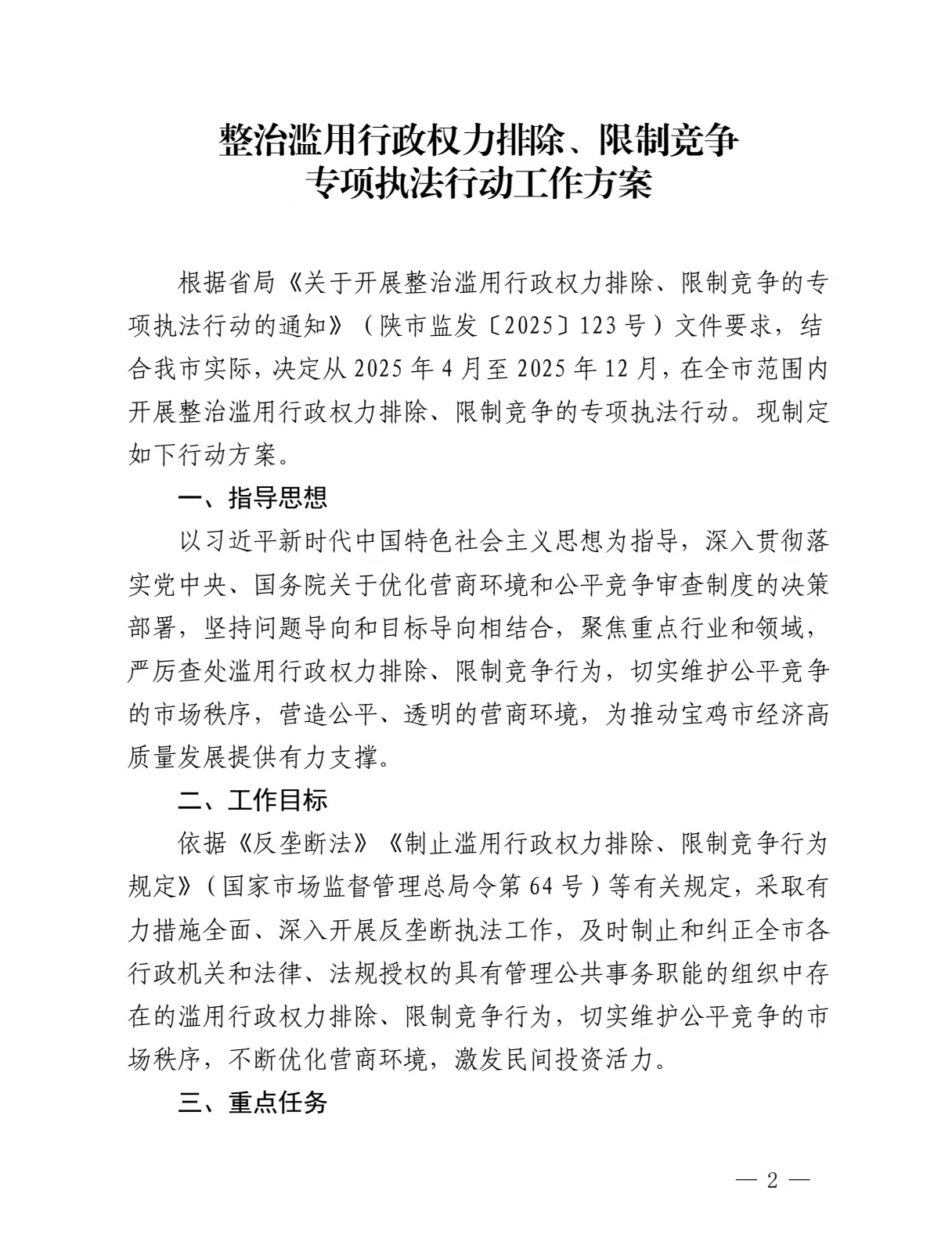 宝鸡市凤翔区市场监督管理局关于印发《整治滥用行政权力排除、限制竞争专项执法行动工作方案》的通知