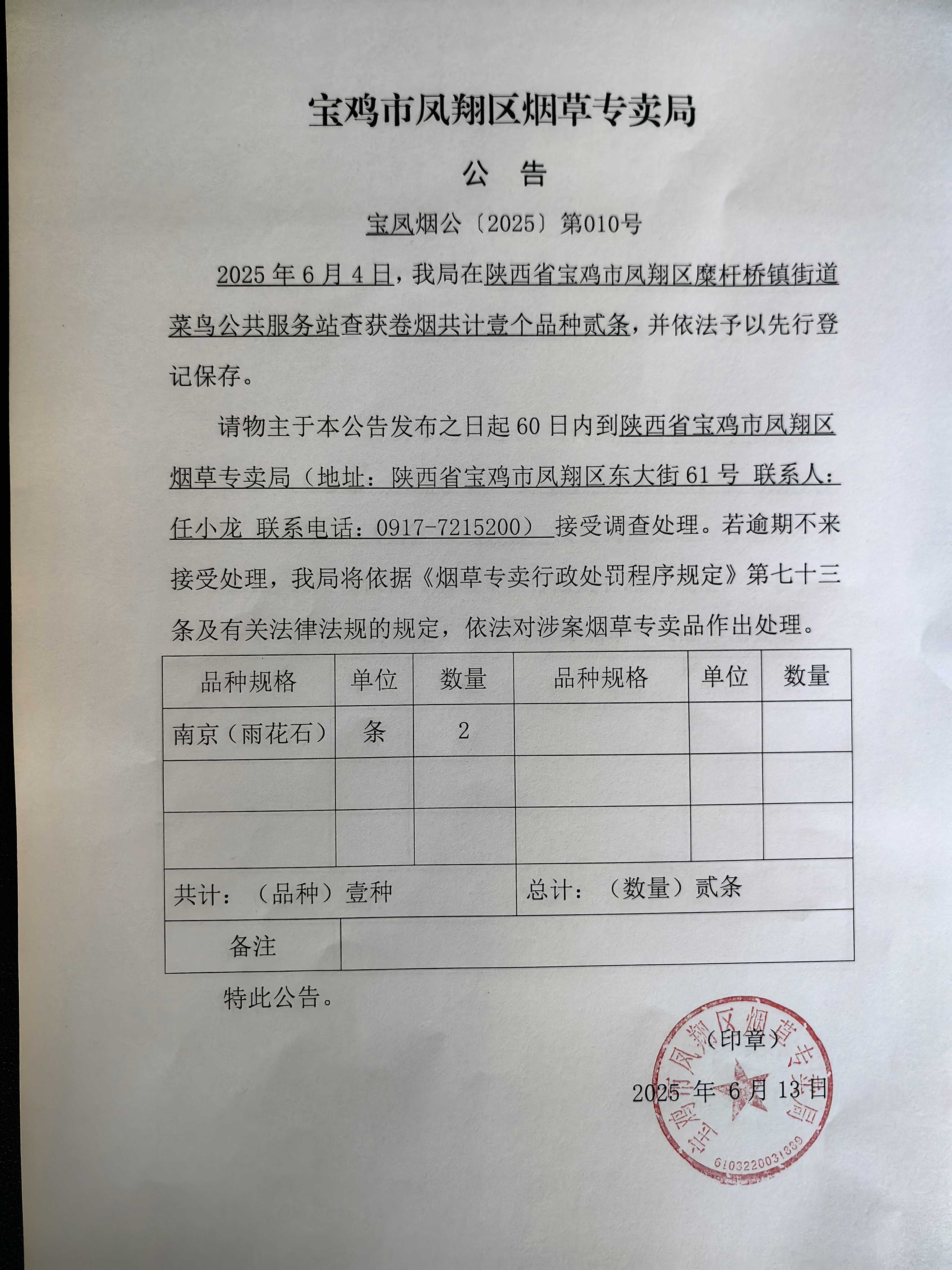 宝鸡市凤翔区烟草专卖局公告 宝凤烟公〔2025〕第010号