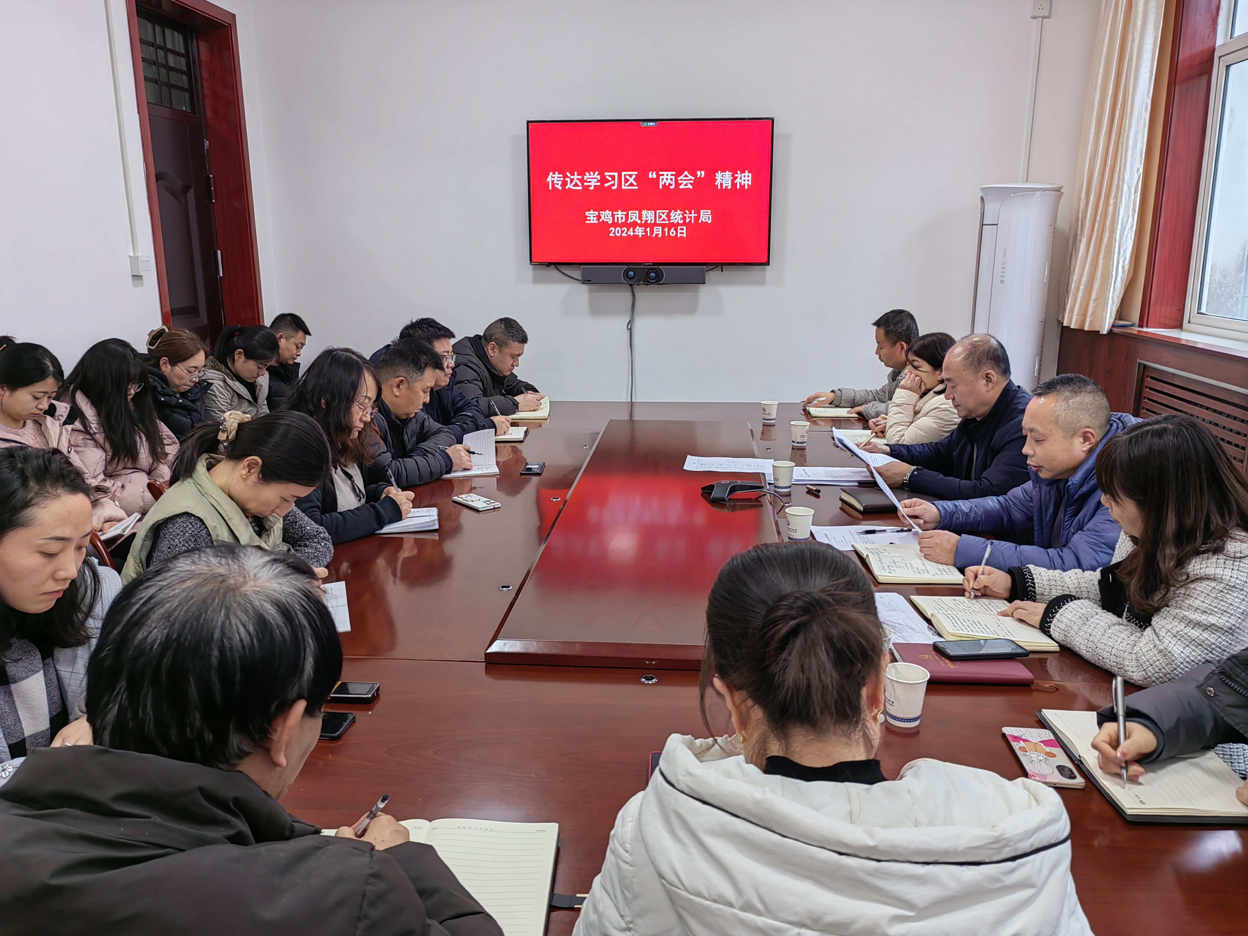 1月16日下午,凤翔区统计局召开全体干部会议,传达学习区两会精神。区统计局主要负责同志领学区政府工作报告相关内容和区委书记王宏强重要讲话。
