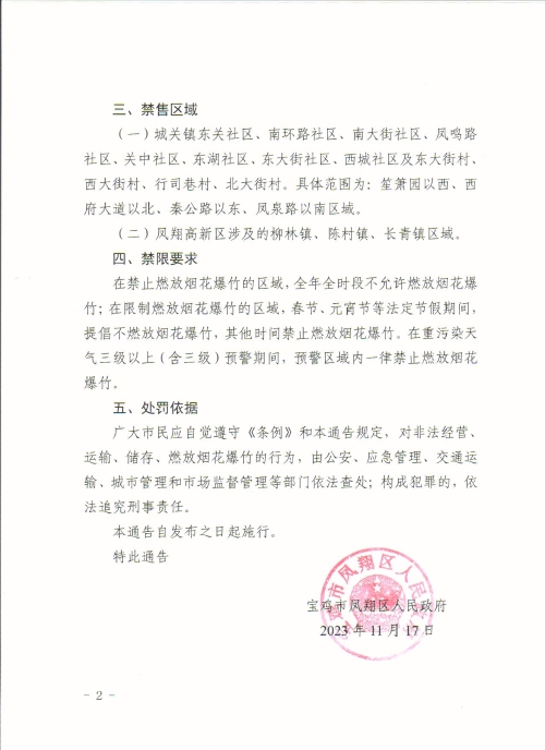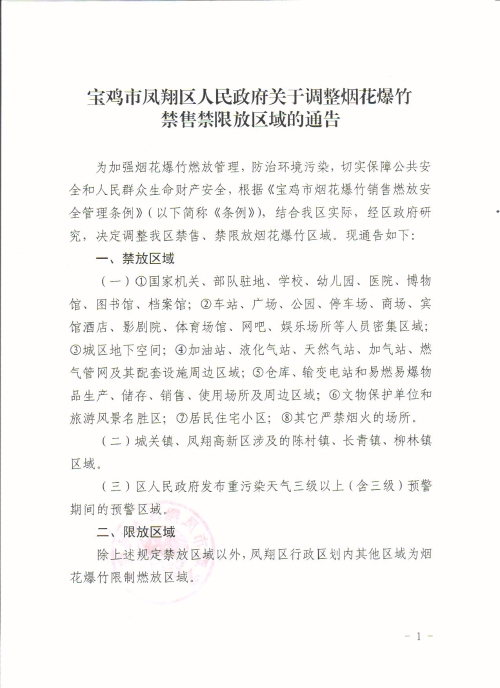 宝鸡市凤翔区人民政府关于调整烟花爆竹禁售禁限放区域的通告