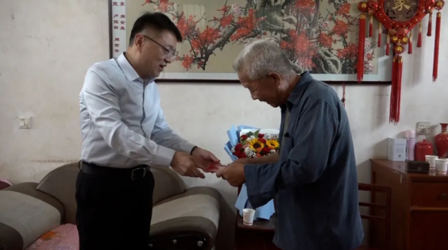 在卢立明家中,王宏强与老党员一起聊家常、叙冷暖,详细询问老党员生活起居、身体状况和子女就业情况。
