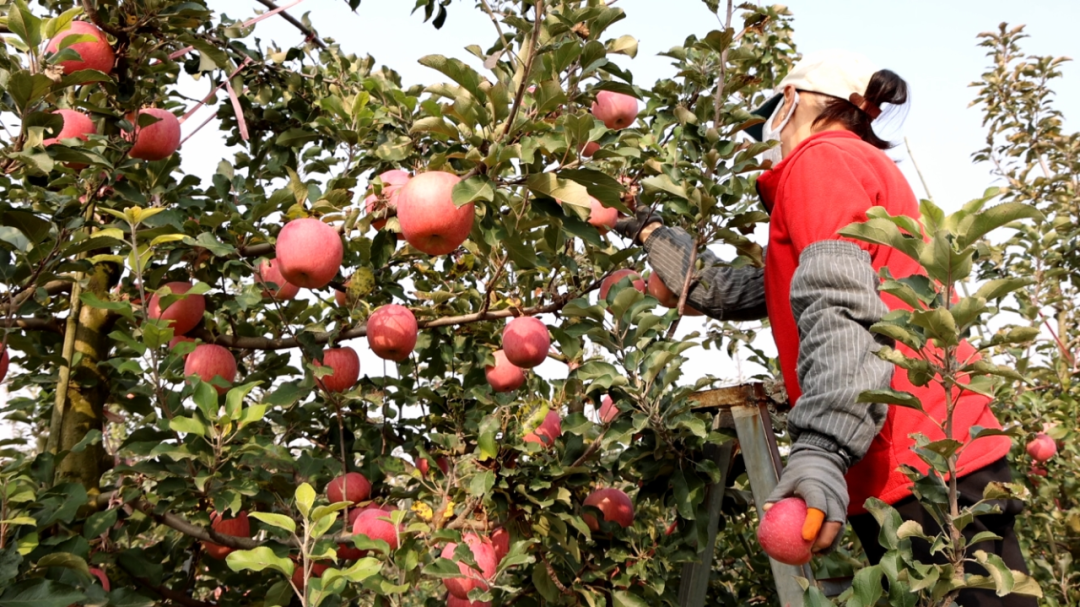 11月7日,记者在范家寨镇“绿宝果业”的苹果园里看到,一棵棵苹果树整齐排列,红彤彤的苹果挂满枝头,散发着诱人的芳香。饱满圆润的苹果压得树枝微微弯曲。