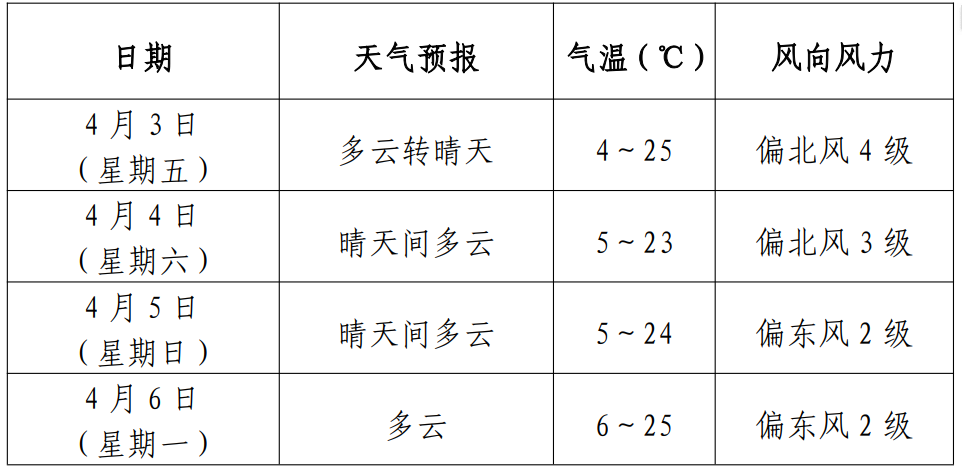 “清明节”假日期间天气预报根据最新气象资料分析,预计 2026 年“清明节”假日期间, 我区天气以晴到多云为主。其中,3—4 日全区有 4 级左右偏北 风,阵风 6 级以上,并伴有浮尘和扬沙天气,日最高气温 26℃; 日最低气温 4℃。 逐日天气预报如下: