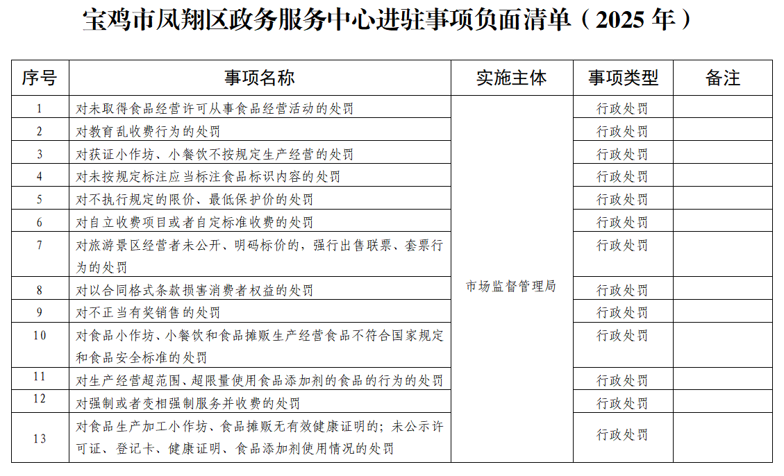 第一条 为全面落实《宝鸡市凤翔区加快推进政务服务标准化规范化便利化大力提升“秦务员”政务服务能力实施方案》(宝凤政办发〔2023〕14号)文件要求,进一步规范全区政务服务中心(以下简称政务中心)政务服务事项进驻工作,制定公开进驻事项负面清单,保障人民群众知情权、参与权、表达权、监督权,制定此制度。