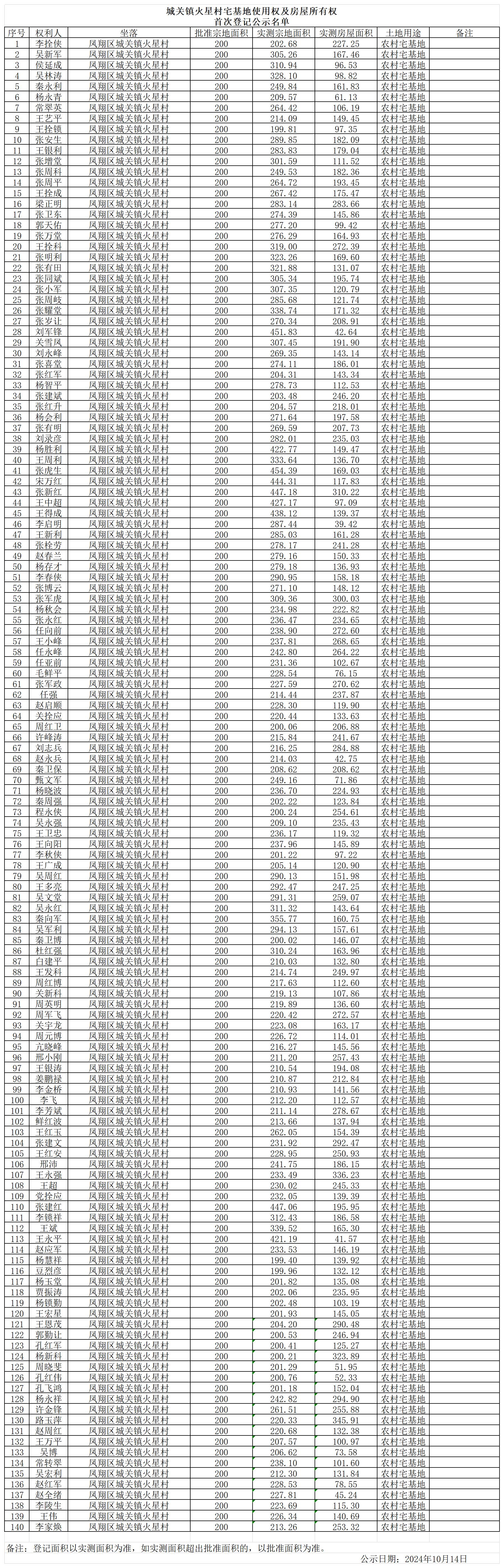 附件:城关镇火星村宅基地使用权及房屋所有权首次登记公示名单