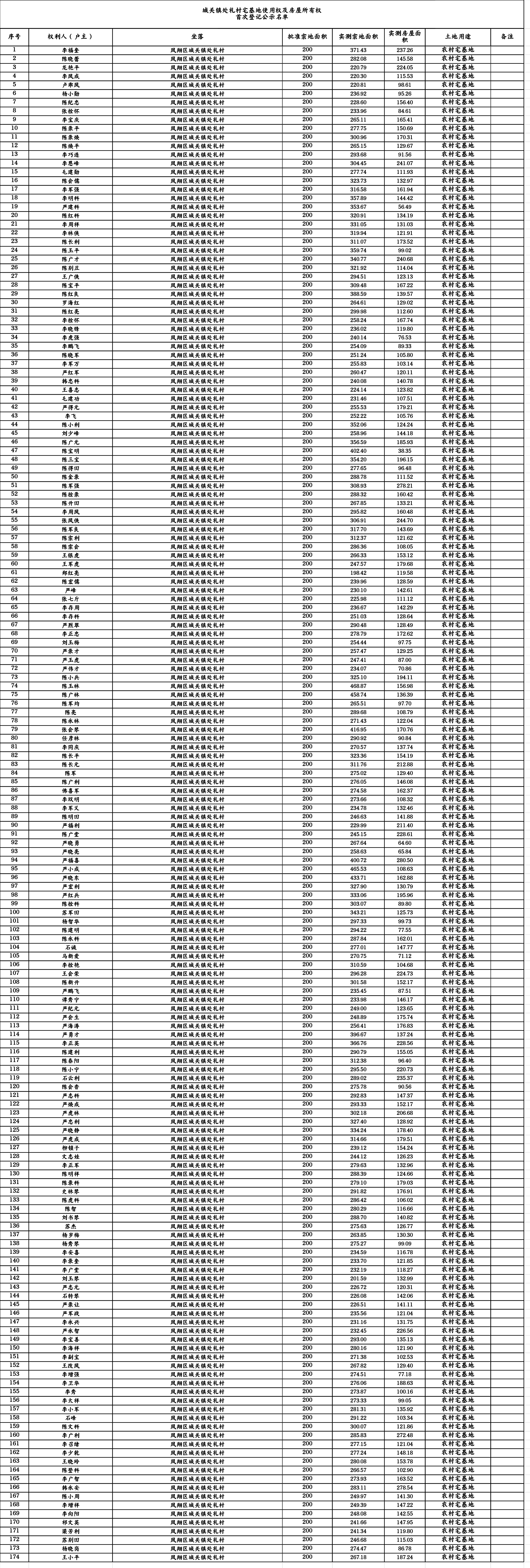 附件:城关镇处礼村宅基地使用权及房屋所有权首次登记公示名单