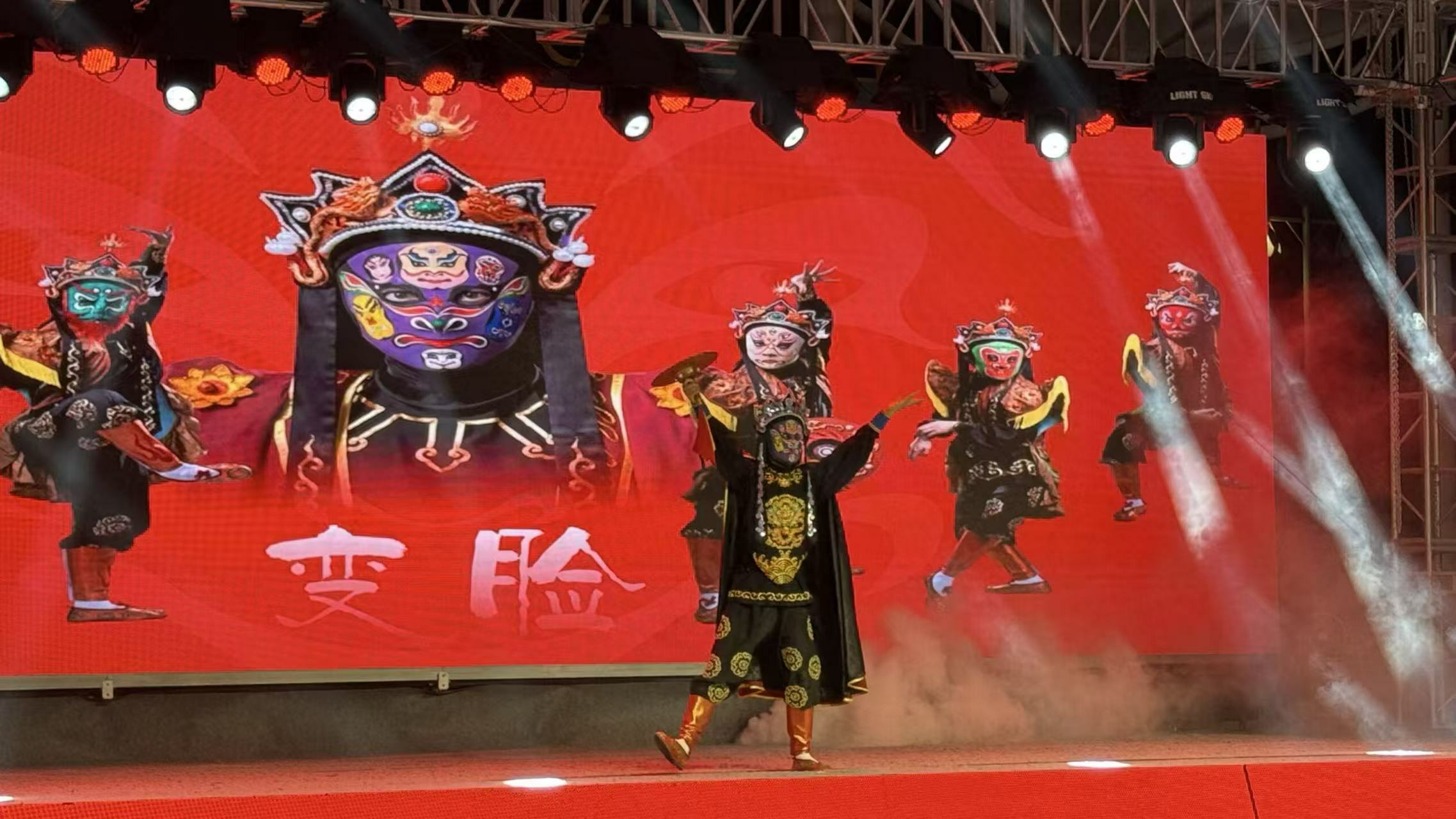 在文艺表演环节,节目丰富多彩、形式多样。歌曲《美丽之路》《阳光路上》《向往神鹰》《神奇的九寨》等,动人的歌声传递出对美好生活的向往,仿佛将观众带到了辽阔的草原与秀美的九寨风光之中;乐器表演,凭借精湛技艺,让乐器之音在现场流淌;美猴王、川剧变脸表演,奇幻的变脸技艺让观众连连称奇;舞蹈《太平盛世》《幸福中国一起走》等,展现出盛世之下的繁荣景象。期间,还穿插了政策解读与企业推介环节。区商务局干部陶今进行了政策解读,国粹凤香、旺客隆超市也带来企业推介,通过互动形式,让大家更好地了解国粹凤香、旺客隆品牌,引发了现场观众的兴趣。